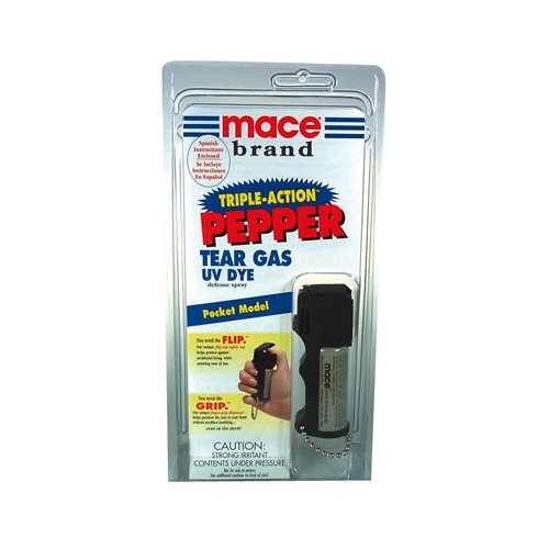 Mace Brand Triple Action Pepper Defense Spray- Pocket Model Pocket Model. Easy aim finger-grip feature makes this model ideal for emergency use. Compact design fits comfortably in woman's hand. Features flip-top safety cap, finger-grip dispenser and keychain. 11 gram stream unit sprays 6-12 feet. Contains 5, one second bursts